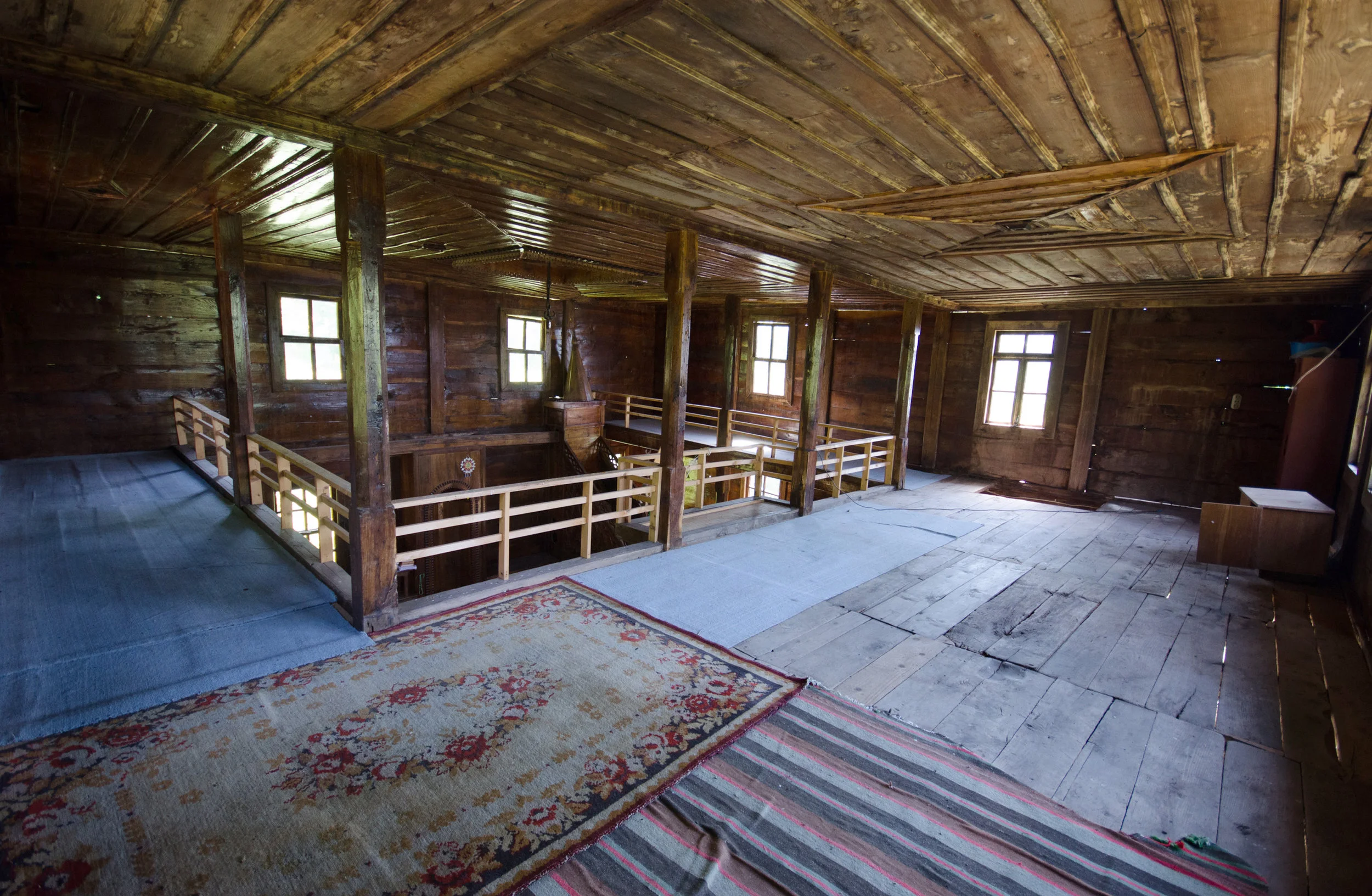 After an earlier mosque was destroyed during the course of the 1877-1878 Russo-Ottoman War (the conflict that eventually brought Adjara into the Russian Empire), local craftsman Usta Kikava Basiladze built the present Uchkhiti village mosque. This simple wooden mosque represents a transitional period between the elaborate incised carvings of the Ottoman era and the colorful murals and applied ornament of the later Russian imperial era. The prayer hall features few carvings and no paintings, but the woodwork is lacquered and well-maintained. Two simple ceiling medallions with a star and crescent motif frame the small, unpainted dome. Some elements of the prayer hall appear to be new, including the mihrab, mezzanine railings, and minbar, which features rather crude approximations of common applied motifs. Horizontal wooden bars on the front windows are an interesting remnant from an earlier era (see, for example, the wooden window lattices at Kvirike mosque).